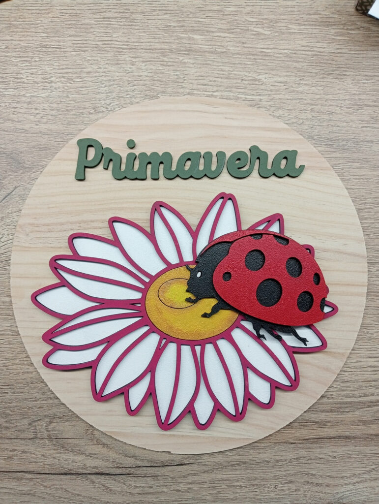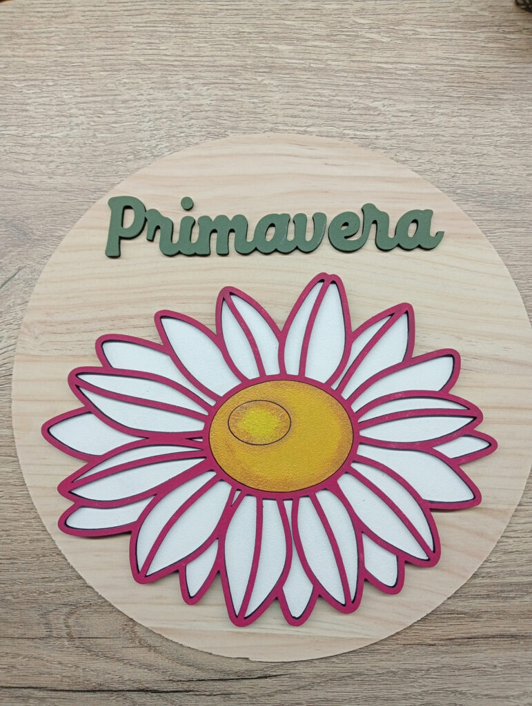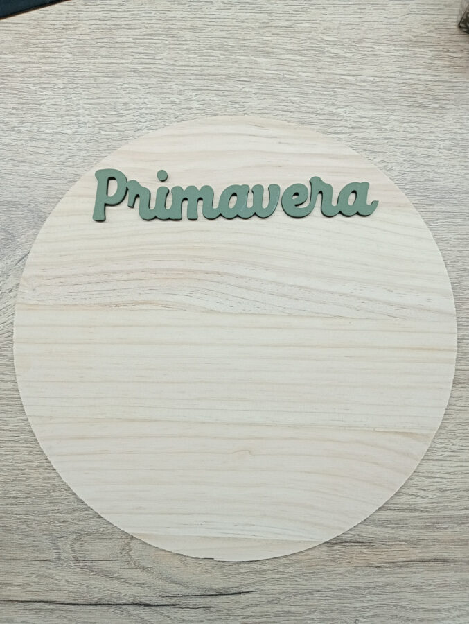 Comienza la primavera y realizamos un letrero sobre un disco de madera de 25 cm de diametro.